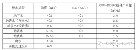HFUF膜過濾設計方式以能耗比較低全流過濾為主,另外對于高懸浮物的進水,HFUF也可采用常規超濾的錯流過濾方式以減小膜污堵的速度,并輔以適當的反洗和氣洗頻率,減少膜表面的污堵,節省能耗,改善出水水質。